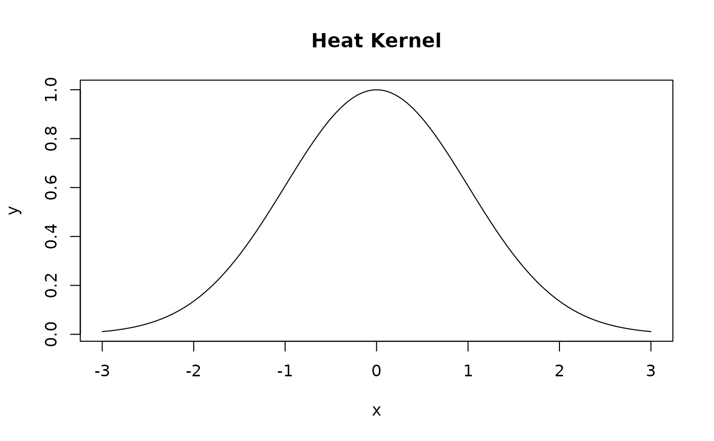 This function computes the heat kernel, which is a radial basis function that can be used for smoothing, interpolation, and approximation tasks. The heat kernel is defined as exp(-x^2/(2*sigma^2)), where x is the distance and sigma is the bandwidth. It acts as a similarity measure for points in a space, assigning high values for close points and low values for distant points.