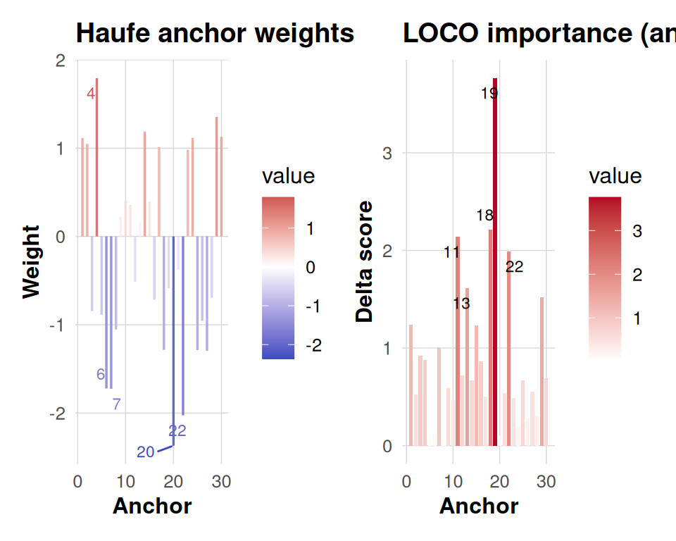 base_labels <- paste0('base', seq_along(bases))The information-map visualization requires anchor-level results from either Haufe transformation analysis or leave-one-covariate-out (LOCO) importance calculations. Since we are working with a synthetic example for demonstration purposes, we create mock anchor vectors that simulate these outputs. In a real-world analysis, you would replace these placeholder vectors with actual Haufe or LOCO results computed from your fitted model.