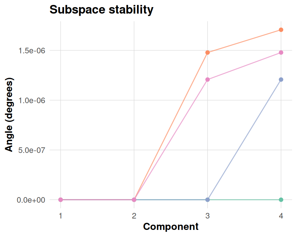 This diagnostic compares each cross-validated basis (or synthetic perturbation here) against a consensus basis by computing principal angles in the metric. Smaller angles mean that a base reproduces the consensus component more closely, so parallel lines near zero indicate a stable subspace, whereas large excursions highlight folds or components that deviate materially.