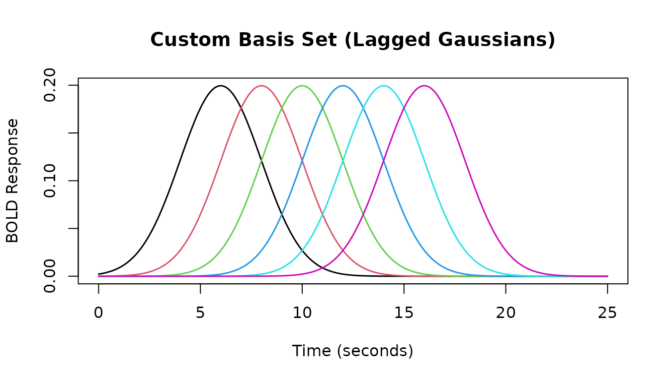 For example, we can create a basis set from a series of lagged Gaussian HRFs: