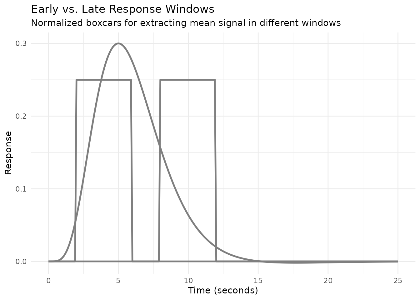 #> Integral of normalized weighted HRF: 2.002Practical Example: Comparing Early vs. Late Response Windows