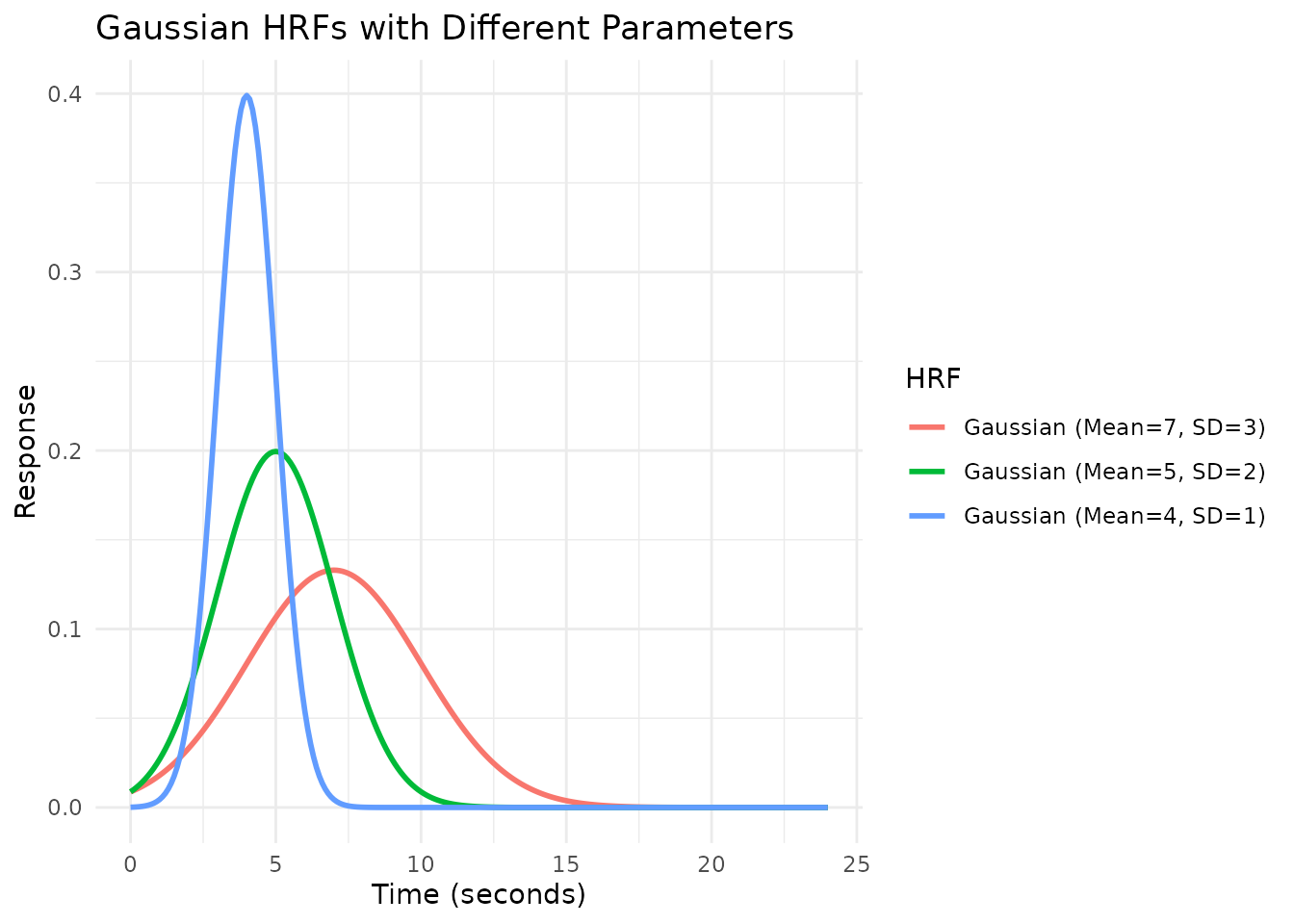 hrf_gauss_5_2 <- gen_hrf(hrf_gaussian, mean = 5, sd = 2, name = "Gaussian (Mean=5, SD=2)")