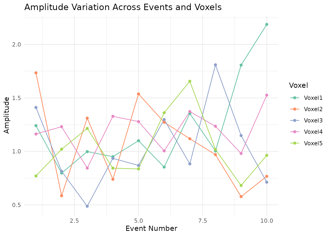 ggplot(amp_long, aes(x = Event, y = Amplitude, color = Voxel, group = Voxel)) +