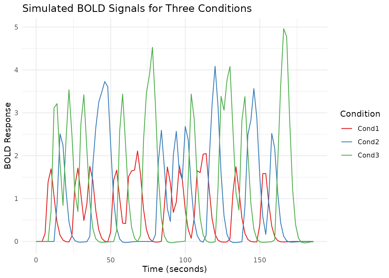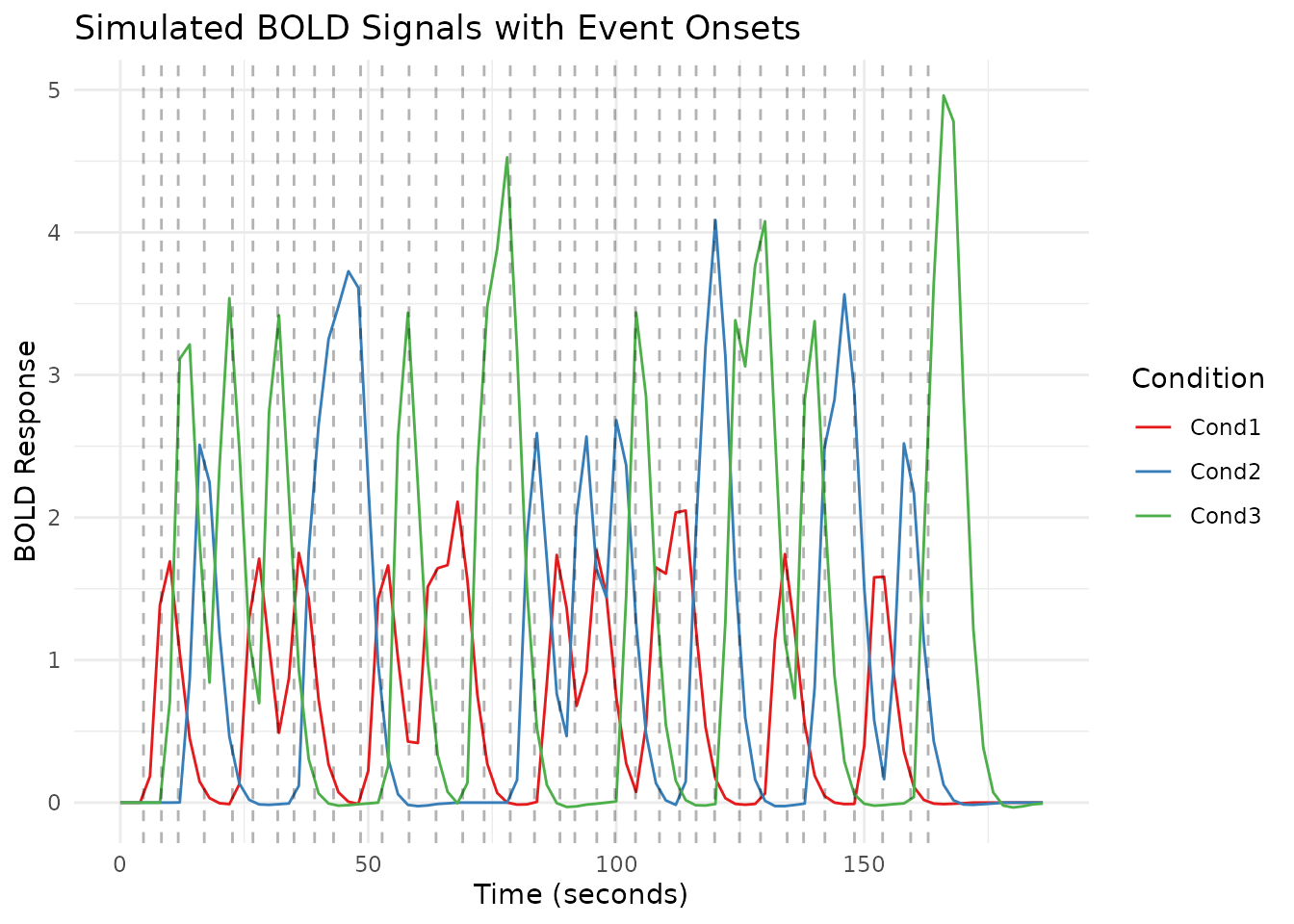 sim <- simulate_bold_signal(ncond = 3, amps = c(1.0, 1.5, 2.0), TR = 2)