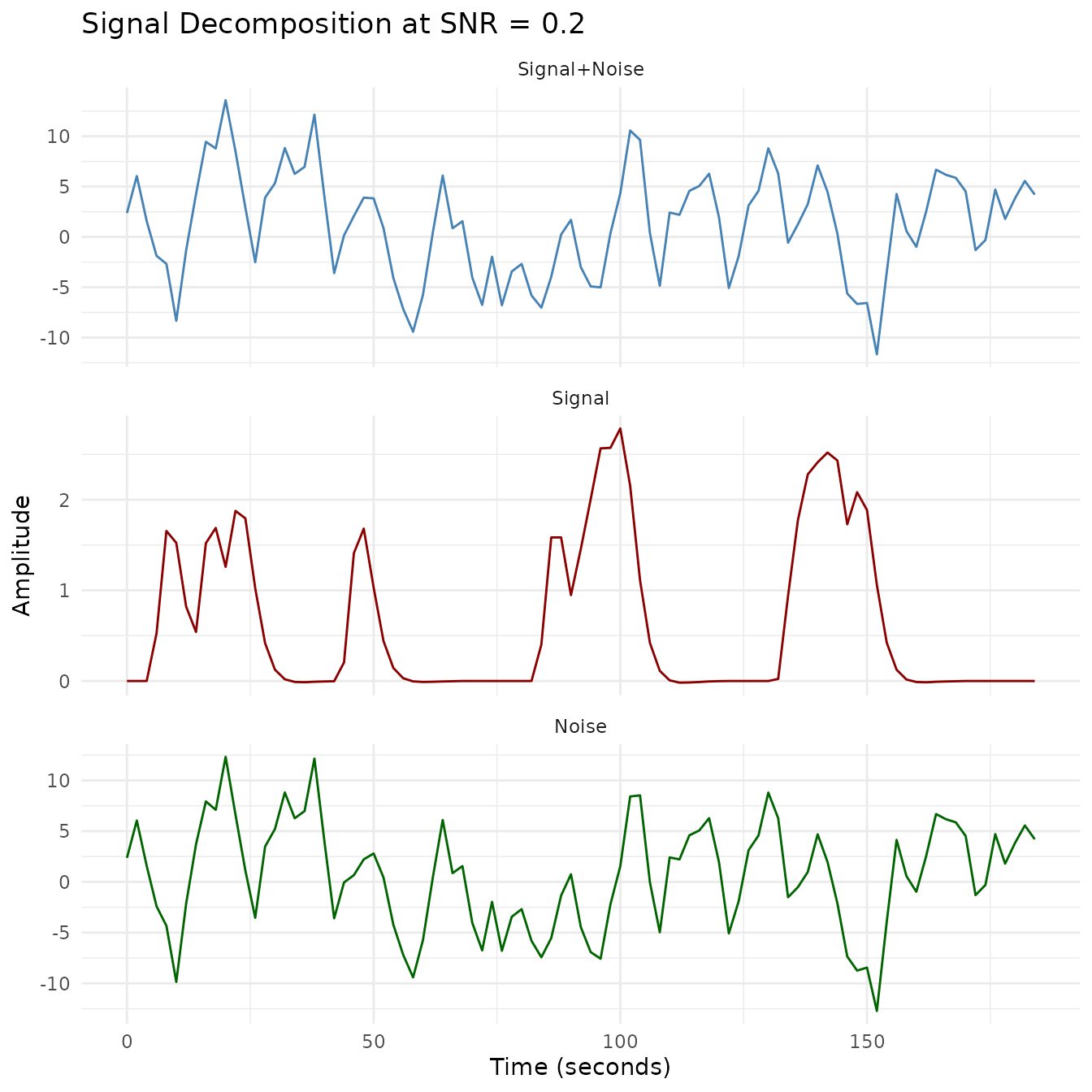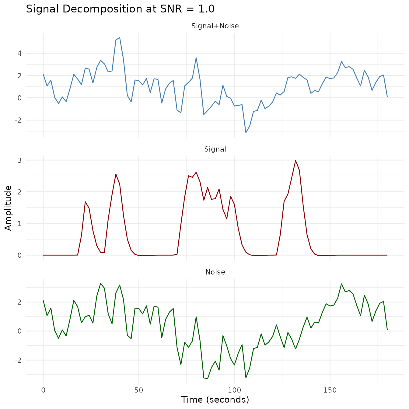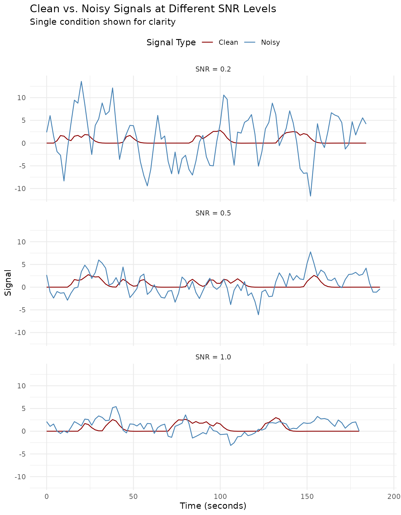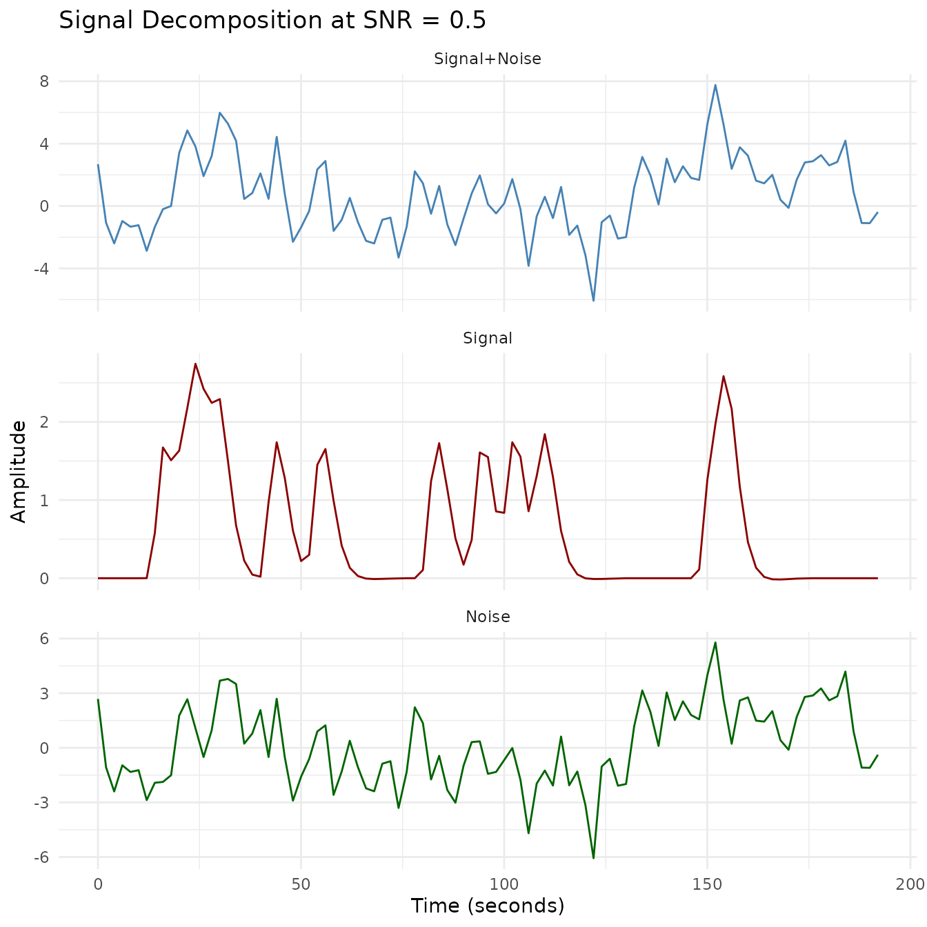 - Signal decomposition: Visualization of how the signal, noise, and combined signal relate at each SNR level