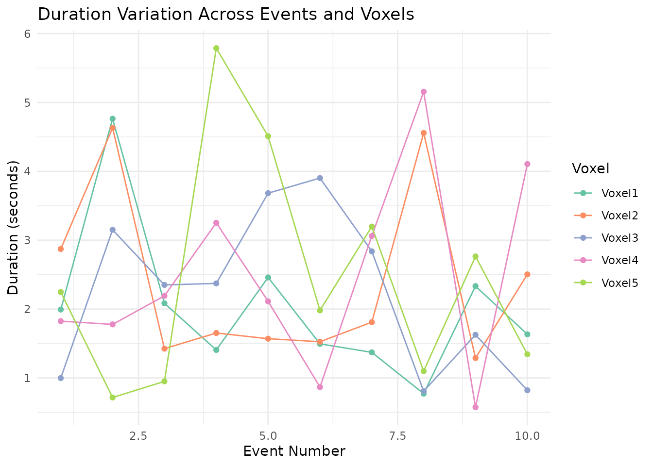 ggplot(dur_long, aes(x = Event, y = Duration, color = Voxel, group = Voxel)) +