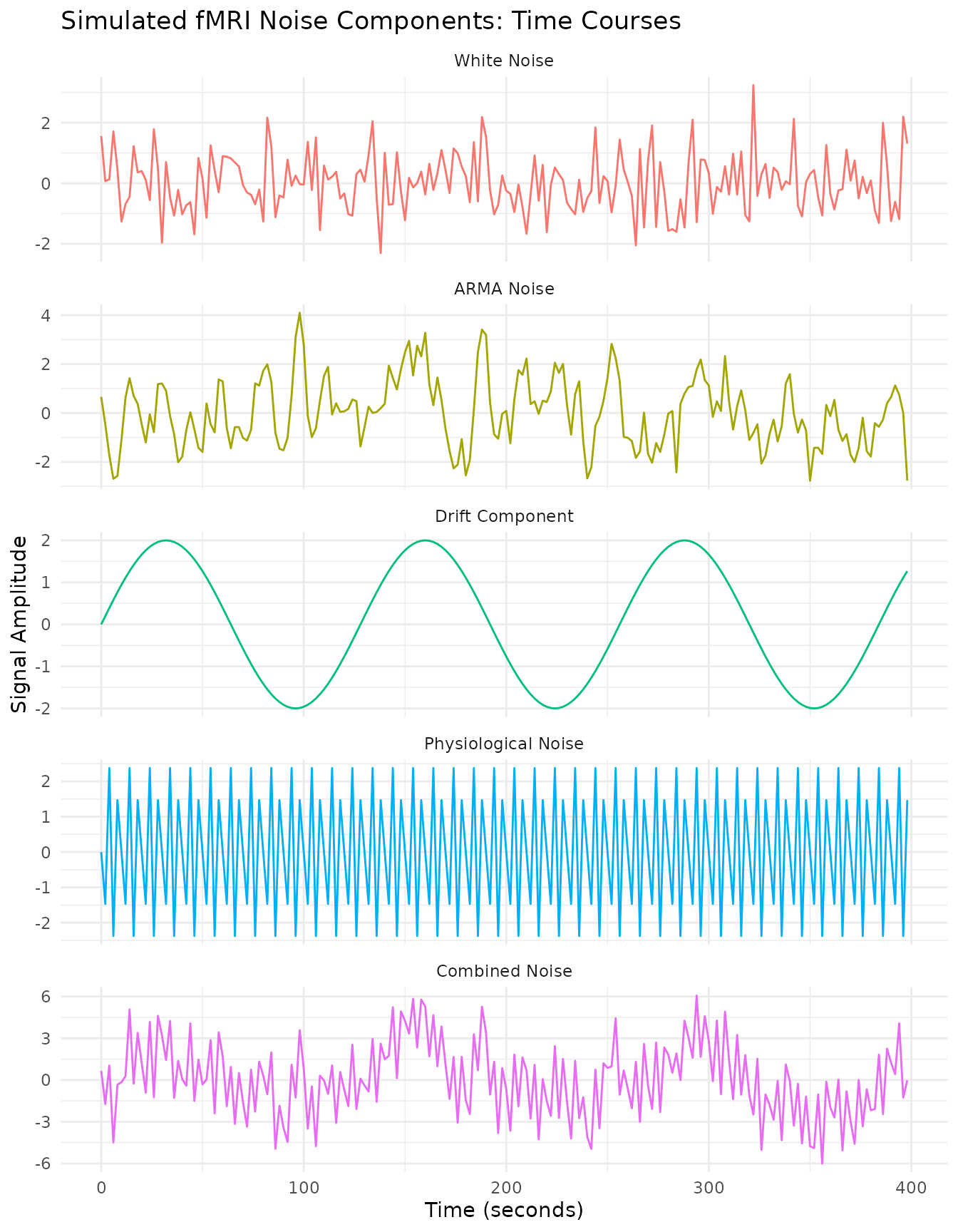 noise_physio <- noise_cardiac + noise_respiratoryFinally, we combine the ARMA, drift, and physiological components to mimic what a real scanner would produce.