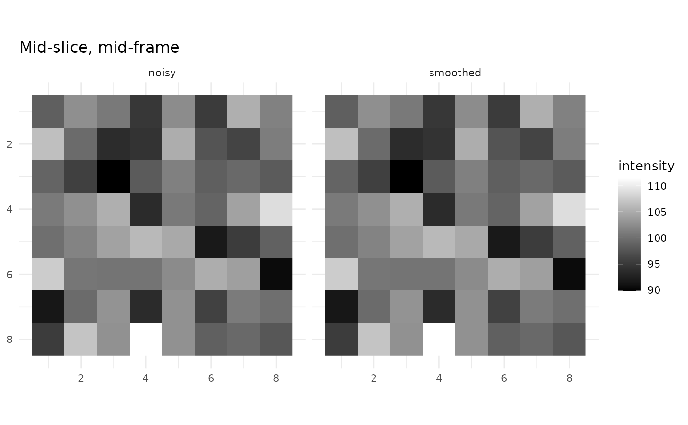 labs(title = "Mid-slice, mid-frame", x = NULL, y = NULL, fill = "intensity")