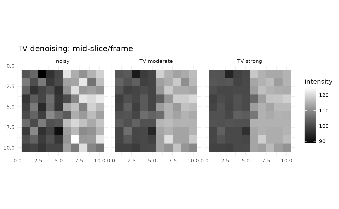 labs(title = "TV denoising: mid-slice/frame", x = NULL, y = NULL, fill = "intensity")