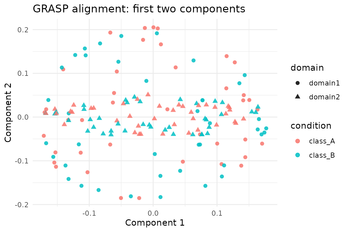 grasp()performs spectral alignment without supervision; class labels are only used here for evaluation. - The post-alignment RMS error can be used as a quick sanity check that the returned embeddings are in a comparable coordinate system.