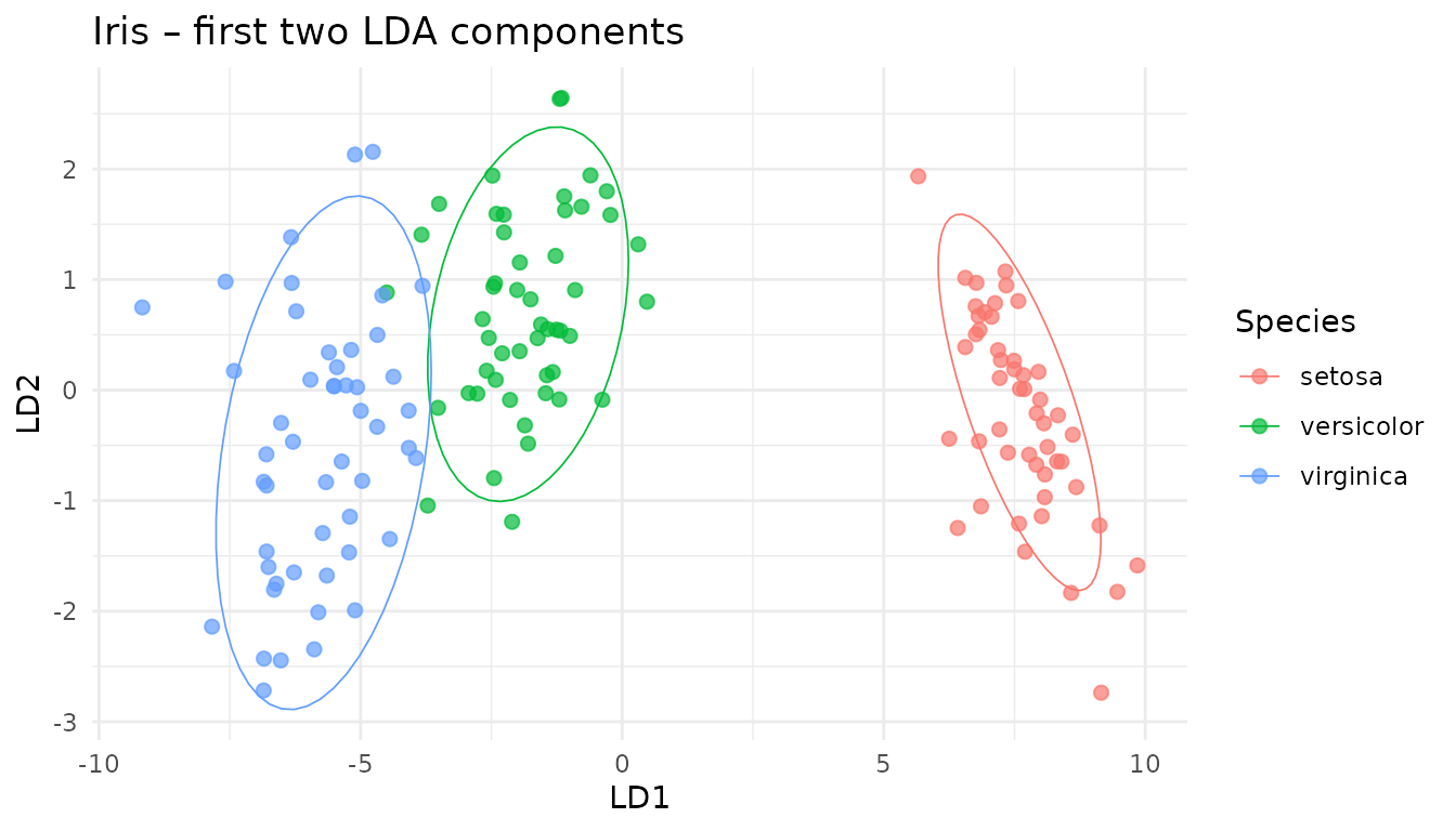 #> [1] "RF Accuracy: 0.977777777777778"The RF sees exactly three input variables (the LDA components) – that keeps trees shallow and speeds-up training.