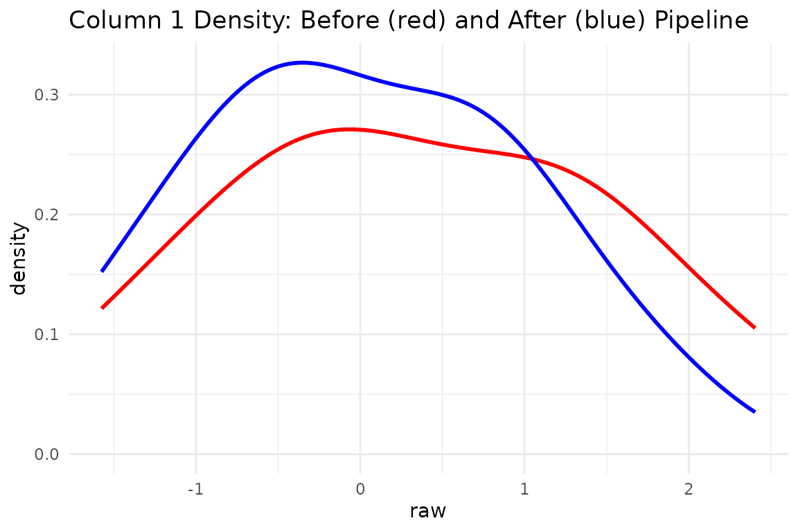 ggtitle("Column 1 Density: Before (red) and After (blue) Pipeline") +